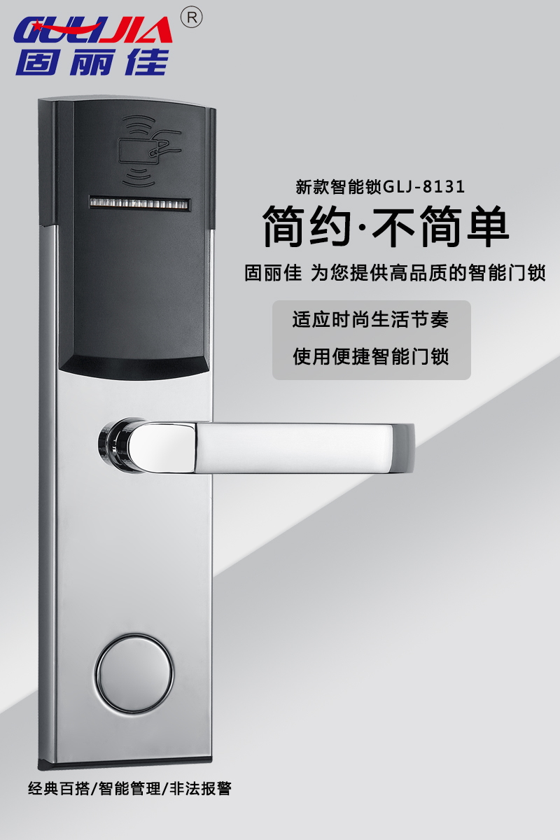 該款GLJ-8131不銹鋼酒店鎖,表面亮鉻處理,美觀耐用,永不褪色!有著經典百搭、智能管理、智能防盜等多種特點。美麗的外觀及精美的設計讓您的酒店更加高大上,給客戶留下深刻印象。固麗佳酒店鎖防盜功能升級,安全,高檔,豪華,為您提供高品質的智能門鎖!