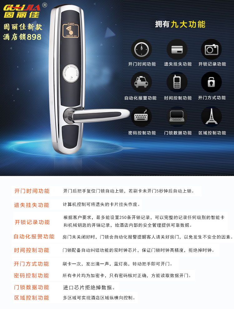 廣州錦盛商務(wù)酒店此次與我們固麗科技合作安裝了固麗佳GLJ-898FS的新款智能電子酒店門(mén)鎖,此款酒店鎖對(duì)每個(gè)細(xì)節(jié)精益求精,在莊嚴(yán)氣派中追求奢華優(yōu)雅,而融入現(xiàn)代設(shè)計(jì)手法后,則更貼近于實(shí)用性。其豪華的氣質(zhì)更是奢華與尊貴的象征,是各大星級(jí)酒店賓館首選。固麗佳酒店鎖可靠的質(zhì)量與完善的售后服務(wù)是各大酒店安裝智能門(mén)鎖的首要選擇。